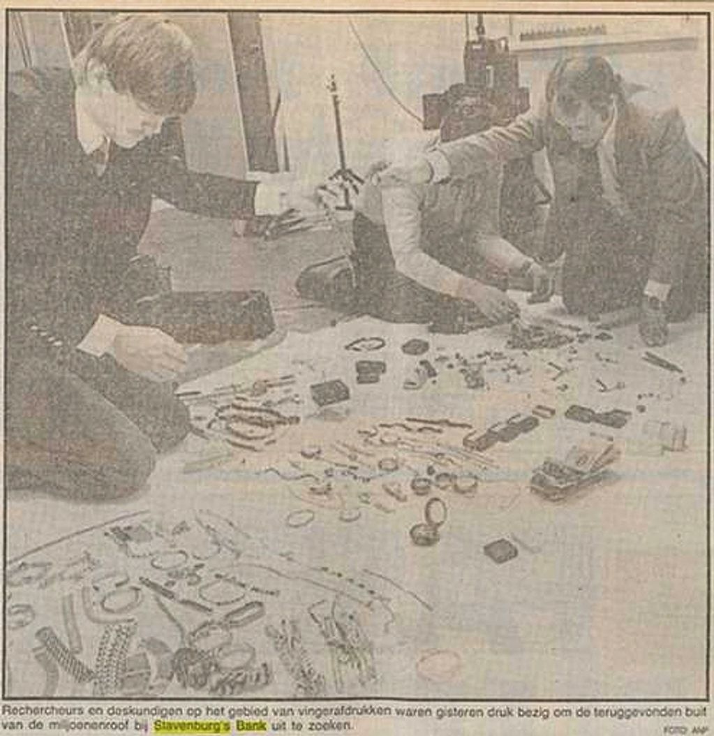 Opleiding tot rechercheur aan Bureau Van Leijenberghlaan (1982). In het voorgaande weekeinde verschaften drie Amsterdammers zich toegang tot tientallen safeloketten in de kluisruimte van de Slavenburgs Bank en namen voor miljoenen aan sieraden, waardepapieren en nog veel meer mee. Links op de foto een jongere versie van mij bij het uitzoeken van een klein deel van de buit.